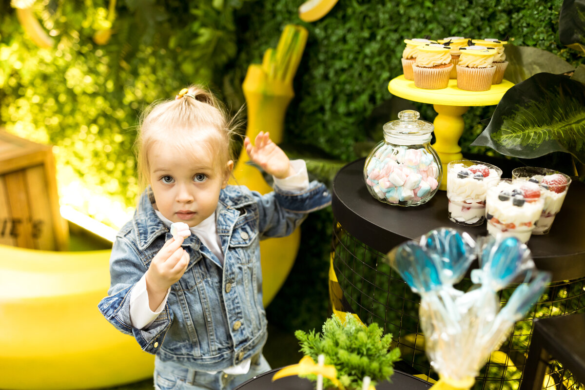 Детский День рождения – это подарки, танцы, смех, активные игры и огромный расход энергии. Дети носятся по потолку со скоростью света, прыгают на батутах, танцуют от души всем телом и побеждают в соревнованиях ни силу, ловкость и находчивость. В такой атмосфере даже самые привередливые малоежки в определенный момент прибегут и скажут «Мам, что есть покушать?! Я бы сейчас и слона съел!». Чтобы подкрепиться, набраться сил и убежать опять – «Ухх, там еще столько всего интересного!». Дети на празднике не хотят тратить много времени на еду. Они хватают что-нибудь вкусненькое и лопают на бегу без отрыва от веселья. Поэтому у вас всегда должны быть наготове небольшие и удобные перекусы. Что это может быть? ФРУКТЫ Фруктовые нарезки, фруктовые корзинки, фруктовые шпажки – с этими полезными и вкусными сладостями можно играть бесконечно. Какие-то фрукты можно оставить на столе целиком – яблоки или бананы. Какие-то сложить кусочками в красивые стаканчики. А из каких-то можно даже выложить причудли