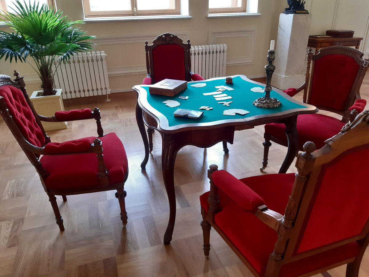 Дамы и мужчины постарше были увлечены карточными играми. Для них в зале находилось несколько ломберных столов. Такие столы имеют складную столешницу, с внешней стороны она отделана деревом, а посередине - зеленое сукно. На нем делали пометки мелом во время игры.