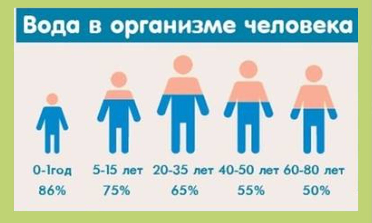 Наш организм при рождении более 80% составляет вода. По ходу жизни человека объем воды в организме уменьшается и в пожилом возрасте, если человек не соблюдает питьевой режим и мало пьет воды, его тело иссыхает и начинает морщиниться.