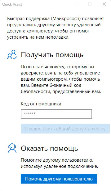 Пользователи систем Windows 10/11, могут легко помочь устранить какую-либо проблему с другим ПК удаленно, с помощью встроенного в систему приложения под названием "Быстрая помощь". Работает оно практически также, как и известный многим TeamViewer и доступно всем пользователям Windows бесплатно и без ограничений. 1. Первым делом в меню "Пуск" открываем пункт "Быстрая помощь". 2. Затем нажимаем на кнопку "Помочь другому пользователю" и авторизуемся в аккаунте Microsoft. Код. который мы получим по итогу данных действий, нужно сообщить пользователю, которому вы хотите помочь. 3. После того. как пользователь введет данный код, ("Пуск", "Аксессуары Windows" -> "Быстрая поддержка"), выбираем параметры общего доступа, которые вам необходимы для оказания помощи: "Получите полный контроль" или "Просмотр экрана".