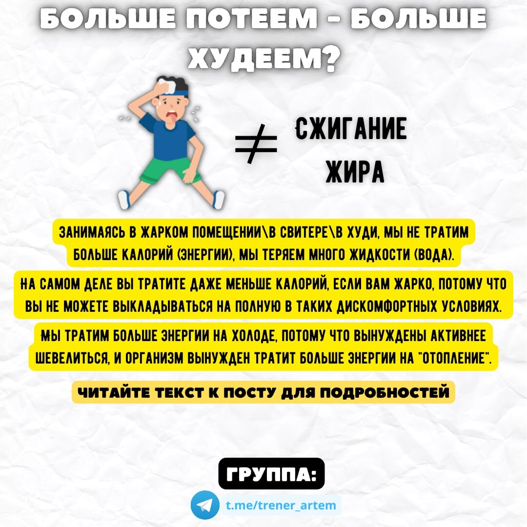 Возможно вам кажется, что в жару вы больше сожжете жира, ведь вы больше потеете? А вот и нет. Пот не индикатор того, что вы тратите много калорий. Хотя он может быть таким индикатором. Но сам по себе факт потения не означает, что вы сжигаете больше жира. Чем вы активнее двигаетесь в единицу времени, тем вы сжигаете больше калорий, а значит и жира, в теории. Только так. Если вам просто жарко, то скорее всего вы не сможете двигаться настолько активно, как могли бы в комфортных, прохладных условиях. По факту на холоде организм вынужден тратить больше калорий на то, чтобы поддерживать нормальную температуру тела. По факту на холоде мы тратим больше энергии, чем на жаре. Обратите внимание, я не призываю вас сидеть под кондиционером в 10 градусах. Глупая затея. Почему же некоторые спортсмены так активно стараются потеть, надевая различные худи и свитера, занимаясь в них? Либо они не в курсе, либо они стараются избавиться от жидкости, воды, максимально потея. Для них важно влезть в определенн