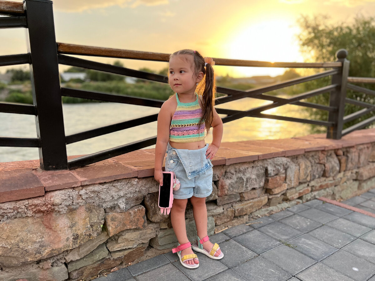 Кончики спрятаны, все готово. Осталось сделать красивые фото. Недалеко от дома мамы у нас речка, очень часто свои изделия я фотографирую там, когда вяжу у мамы в гостях. Пару лет назад там сделали набережную. Я очень боялась, что мое любимое место для фотосессии постоянно, но… стало ещё лучше! Смотрите сами. 😍 Даже не стала обрабатывать, оставила как есть. Здесь очень красивые закаты 😍 Все окрашивается в золото. Вокруг гранитные скалы и постройки сделали в подходящих цветах. Поэтому весь комплекс на закате становится тёплым, золотистым, словно в какой-то красивой детской сказке! Второй образ с радужной юбочкой. Эту юбочку мы покупали давно, а цвета так здорово подошли 🥰 Можно сделать и дерзкий образ с джинсовыми шортами или комбинезоном, а можно нежный праздничный с юбочкой 😍 Получилась и отличная прогулка, и красивая фотосессия! 🥰 Вам какой образ больше понравится? #кроптоп #кроп-топ крючком #радужный кроп-топ #радужный топ крючком