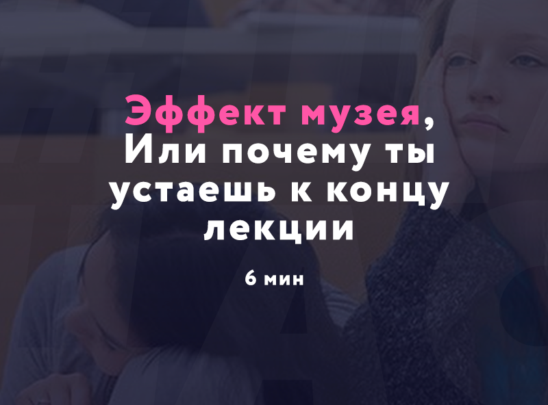 Часто у вас бывало такое, что приходите на экскурсию в музей, первый час с удовольствием слушаете гида, задаёте вопросы, рассматриваете картины и статуи. Через час интерес начинает падать, вы уже прекратили читать подписи под каждой инсталляцией и картиной, на третий час вам становится тошно, ну и, в конце концов, уже думаете как бы поскорее пойти в буфет. Такое явление называют «эффект музея».