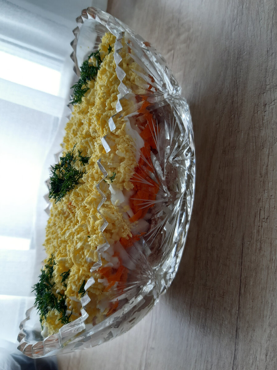 Ингредиенты: Картофель 2-3 шт Морковь 1-2 шт Яйцо 3 шт Консерва 1 б(сайра или тунец) Лук(по желанию) Майонез Приготовление: Яйца и овощи отварить,остудить,очистить. Консерву размять вилкой,лук мелко порезать. Выложить салат слоями: -картофель на крупной тёрке сетка майонеза -консерва и лук -морковь на крупной тёрке и майонез -белок на крупной терке и майонез -посыпать тёртым желтком Украсить по желанию.Салат получается вкусный и нежный!Приятного аппетита!!!