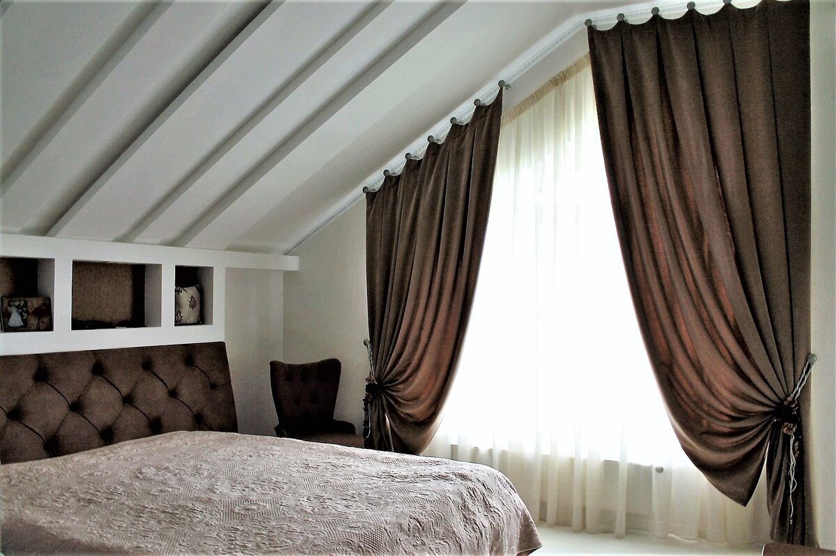 Конечно, самостоятельно решить вопрос по декорированию подобных окон достаточно сложно. Купить прямые полотна на стандартное окно можно, а вот придумывать функциональный и красивый вариант на наклонное окно лучше с профессиональным декоратором.