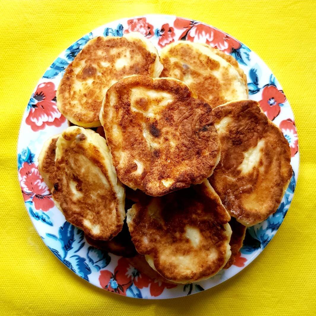 Как давно я не пекла сырники... И вот сегодня у меня сырники с изюмом. Очень вкусные. Делаются быстро, легко. Количество изюма можно изменить по вашему желанию. Количество яиц зависит от качества творога: насколько он сухой. Готовьте с удовольствием! Ингредиенты: Творог, Изюма, Муки, Соль , Сахар , Яйца, Масло растительное для жарки Способ приготовления: Изюм залить горячей водой на 10 минут. Выложить творог в миску, добавить соль, сахар, муку, яйца. Всё хорошо перемешать. Затем добавить изюм. Ещё раз перемешать. Сформировать небольшие сырники, обвалять в муке. Выложить на сковороду с разогретым растительным маслом и обжарить с двух сторон до золотистой корочки. Выкладываем готовые сырники на салфетку, чтобы удалить лишнее масло. Приятного аппетита!