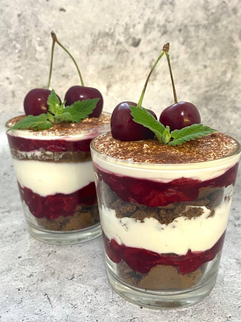 Предлагаю Вашему внимаю рецепт вкуснейшего ПП трайфла с вишней. Он станет Вашим любимчиком! КБЖУ на 100 г: 110/6,6/4,5/12 Ингредиенты: Яйцо куриное, Рисовая мука, Разрыхлитель, Какао, Подсластитель , Мягкий творог, Рикотта, Вишня замороженная, Кукурузный крахмал Способ приготовления: Подготовить все ингредиенты. Для бисквита взбиваем белки с добавлением щепотки соли до мягкой пены, добавляем желтки, аккуратно вводим муку, разрыхлитель, подсластитель. Какао добавляем в последнюю очередь. Застилаем противень пергаментом или антипригарным ковриком, выливаем тесто, равномерно распределяем и отправляем в разогретую до 180 градусов духовку минут на 12-15. После этого достаём и даём полностью остыть. Пока корж остывает займёмся вишневым конфи. Вишню очищаем от косточек, если они есть (кстати, удобнее чистить слегка подмороженную вишню, так сок от ягод не разлетится по всей кухне). Помещаем вишню в сотейник и ставим на огонь, постепенно вводим крахмал, постоянно помешивая, чтобы не было комочк