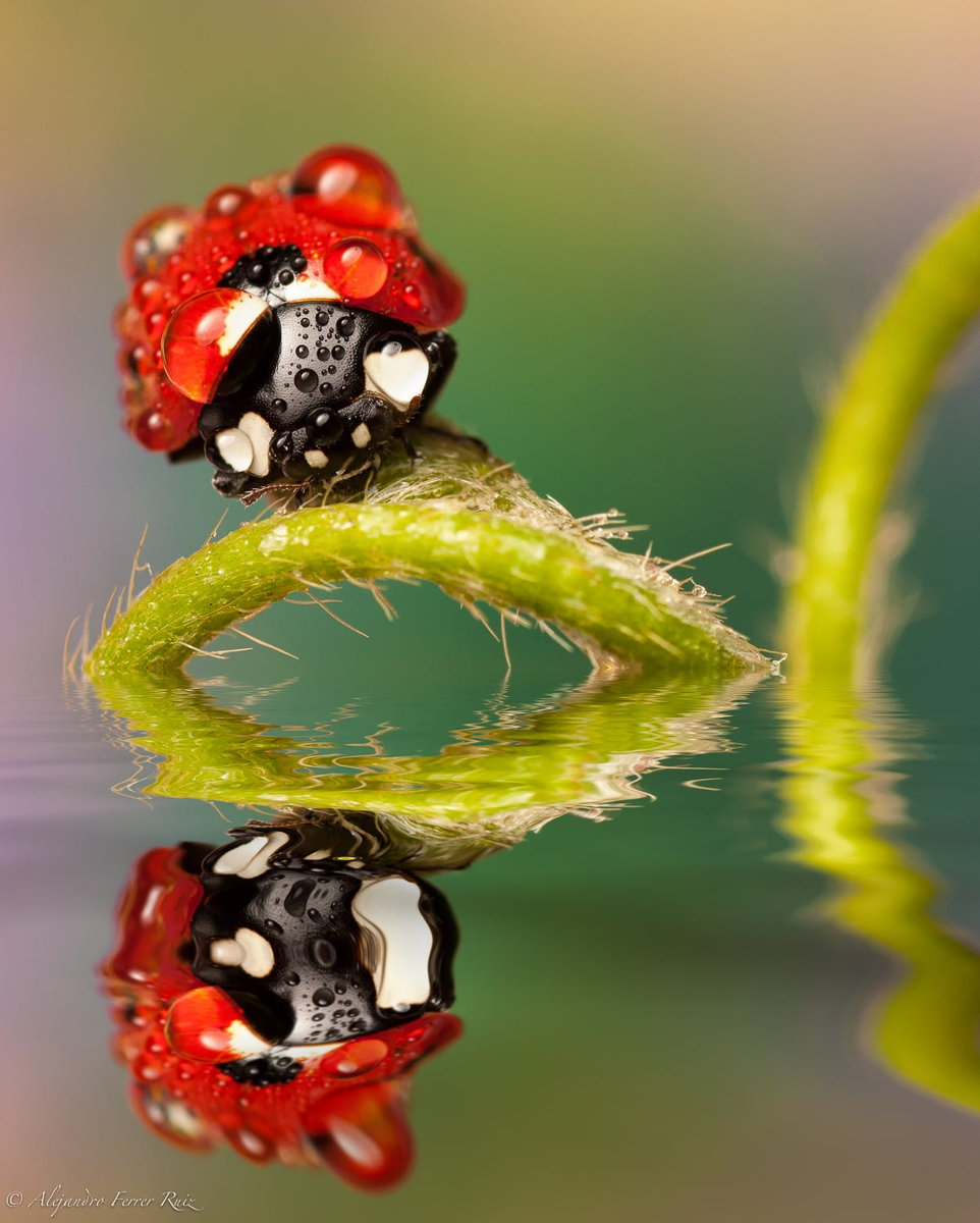 Красота сопровождает нас всюду. Стоит только присмотреться, и становится понятно: мир прекрасен в своём разнообразии и наполнен удивительными деталями. Не всегда красота монументальна, порой она вовсе не заметна глазу. Жаль, что у нас зачастую просто не хватает времени, чтобы замедлить шаг и рассмотреть её. Фотограф Алехандро Феррер Руис (Alejandro Ferrer Ruiz) взялся исправить это досадное недоразумение, продемонстрировав мир в пределах одного зеленого листочка с помощью макросъемки. Главные герои его снимков – насекомые. Чаще всего это божьи коровки в каплях росы. Эти кадры невероятно злободневны – они будто напоминают всеми своими усиками и пятнышками, что скоро настанет настоящая весна. Алехандро Феррер Руис родился и вырос в Испании. Любовь к окружающему миру он почувствовал ещё в детстве. Больше всего его интересовала жизнь насекомых, их повседневные дела и особенности жизни. Однажды фотографу пришло в голову показать, как тяжело приходится божьей коровке. Только представьте,