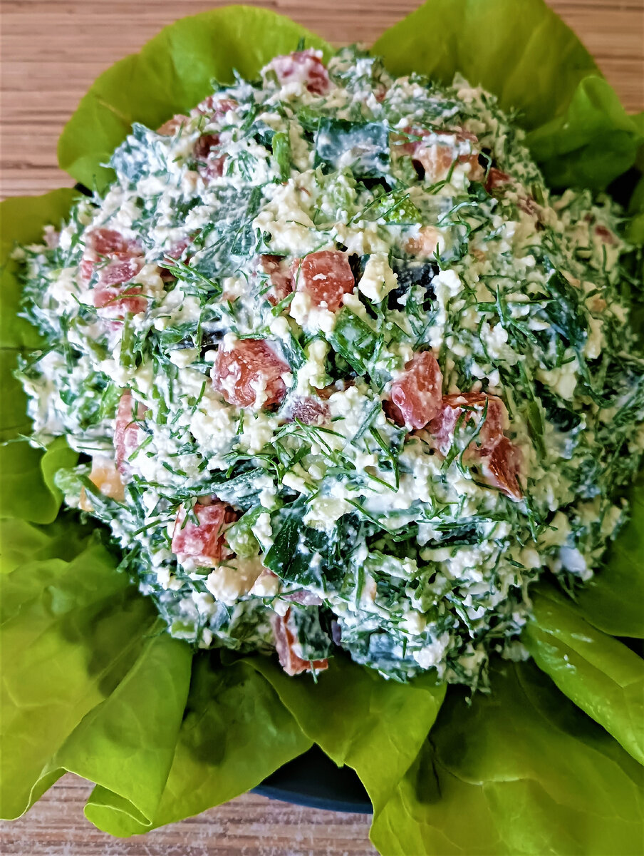 Любимый летний салат с ... творогом. Только полезные ингредиенты. Вкус изумительный и каждый раз новый. И даже сыра не надо!