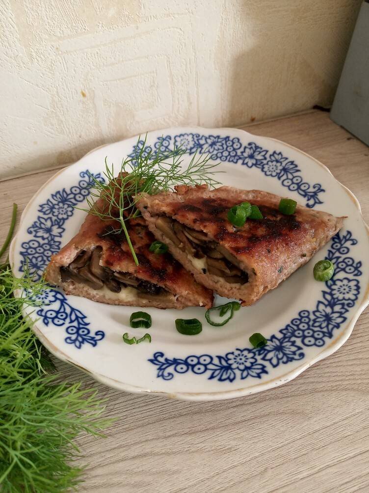 #среда Ингредиенты: Фарш куриный, Грибы, Сыр, Лук репчатый, Панировочные сухари, Соль, перец Способ приготовления: Нарезать грибы тонкими пластинами. Сковороду хорошо разогреть без масла. Выложить на сухую раскалённую сковороду грибы и при высоком огне выпарить влагу, приправить солью и перцем. Куриный фарш соединить с панировочными сухарями и специями в глубокой миске. Лук очистить и натереть к фаршу на мелкой тёрке. Тщательно вымешать фарш. Пергамент смазать растительным маслом. Порцию фарша выложить на пергамент. Растянуть фарш на промасленном пергаменте в круглый пласт толщиной примерно 3-4 мм. Выложить на одну половину грибы-начинку, немного не доходя до края пласта. Сыр натереть на мелкой тёрке. Выложить порцию сыра поверх грибной начинки. Сложить пласт фарша пополам (с бумагой), накрывая начинку. Аккуратно оттягивая, снять пергамент с верхней части фарша. Придавить края заготовки-чебурека, соединяя их и полностью закрывая начинку. Затем снова накройте бумагой. Таким же образом п