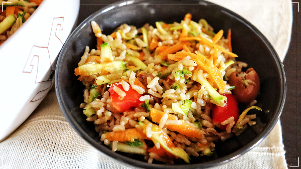 Сложность: легко Подготовка: 20 мин. Приготовление: 30 мин. Порции: 4 Стоимость: средняя Лето будет не летом, если не приготовить хотя бы один раз такой салат с рисом. Салат с рисом, как и средиземноморский холодный салат с пастой, — это идеальное решение для жаркого лета: готовится достаточно быстро, а подается холодным! Одного единственного и стандартного рецепта этого салата нет, поэтому здесь можно дать вволю разгуляться вашей фантазии! В этот раз мне захотелось использовать бурый рис и тыквенные семечки, богатые железом и омега-3. Вы же можете использовать тот рис и орехи, что есть у вас. Ингредиенты: - 320 гр. бурого риса - 3 средних моркови (вес около 160 гр.) - 50 гр. оливок или маслин без косточек - 200 гр. молодых цукини (или кабачка) - 200 гр. помидор черри - 20 гр. тыквенных семечек - 30 гр. оливкового масла - соль и перец по вкусу Приготовление: Приготовление холодного салата из риса я начинаю с отваривания бурого риса в подсоленной воде, предварительно промыв его нескольк