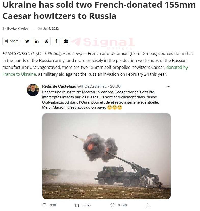 Оказывается, две САУ CAESAR из тех, которые Франция поставила Украине, попали в руки русским не просто так и не в качестве трофея, а после отправились на изучение на «Уралвагонзавод». Все проще — их продали украинские военные. Об этом пишет Bulgarian Military. Обошлась каждая САУ за $120 000 при реальной стоимости в $7 000 000. Информацию болгарское издание приводит со ссылкой на информированные источники в командовании ВС Франции и Интерполе. Они утверждают, что в качестве посредника сделки по продаже самоходных гаубиц выступил некий военный дилер. Журналисты подтверждают, что в настоящее время французские САУ находятся на «Уралвагонзаводе». Сам УВЗ это ранее тоже подтвердил. По мнению аналитиков, это говорит о намерении российской стороны "разобрать их и детально изучить технологии". ТК Signal Захар Прилепин комментирует: По предварительным данным, украинские военнослужащие воспользовались возможностями «даркнета» и предложили продать подобное вооружение третьим странам, при этом, не
