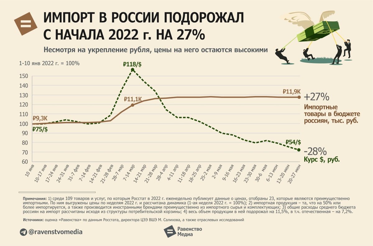 Основной скачок цен был в марте, когда рубль падал до ₽120 за $. В июне рубль укрепился до ₽51,2 за $, что на 22% меньше, чем в начале года, но цены на импорт не снизились.