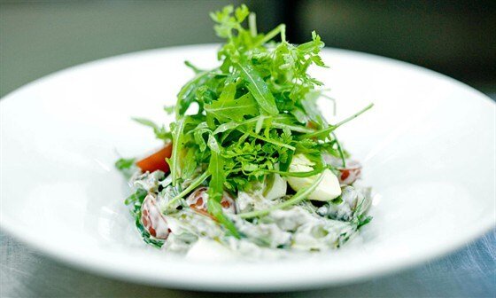 ИНГРЕДИЕНТЫ ПОРЦИИ 4 Говяжий язык 400 г Свежие шампиньоны 280 г Вешенки 400 г Грибы шиитаке 360 г Оливковое масло 60 мл Помидоры черри 200 г Репчатый лук 50 г Куриное яйцо 4 штуки Рукола 100 г Соль 2 г Молотый черный перец 2 г Майонез 100 г Соленые огурцы 200 г Зелень 10 г 1.Отварной говяжий язык нарезать соломкой. Шампиньоны разрезать на 4-части, удалить ножки и нарезать крупными кусочками. Шляпки шиитаке отварить до полуготовности. 2.Грибную смесь обжарить на оливковом масле, добавив соль и перец. У малосольных огурцов обрезать края и нарезать некрупными дольками. Помидоры черри разрезать на 4 части. Лук репчатый нарезать полукольцами; белок сваренного вкрутую яйца — соломкой. 3.Все компоненты соединить, добавить листья рукколы, соль и заправить майонезом. Салат выложить горкой на тарелку, украсить листьями рукколы, по бокам выложить половинки, сваренного вкрутую желтка. Любите читать Дзен «Еды»? Расскажите свое мнение о материале в комментариях и ставьте свои лайки!