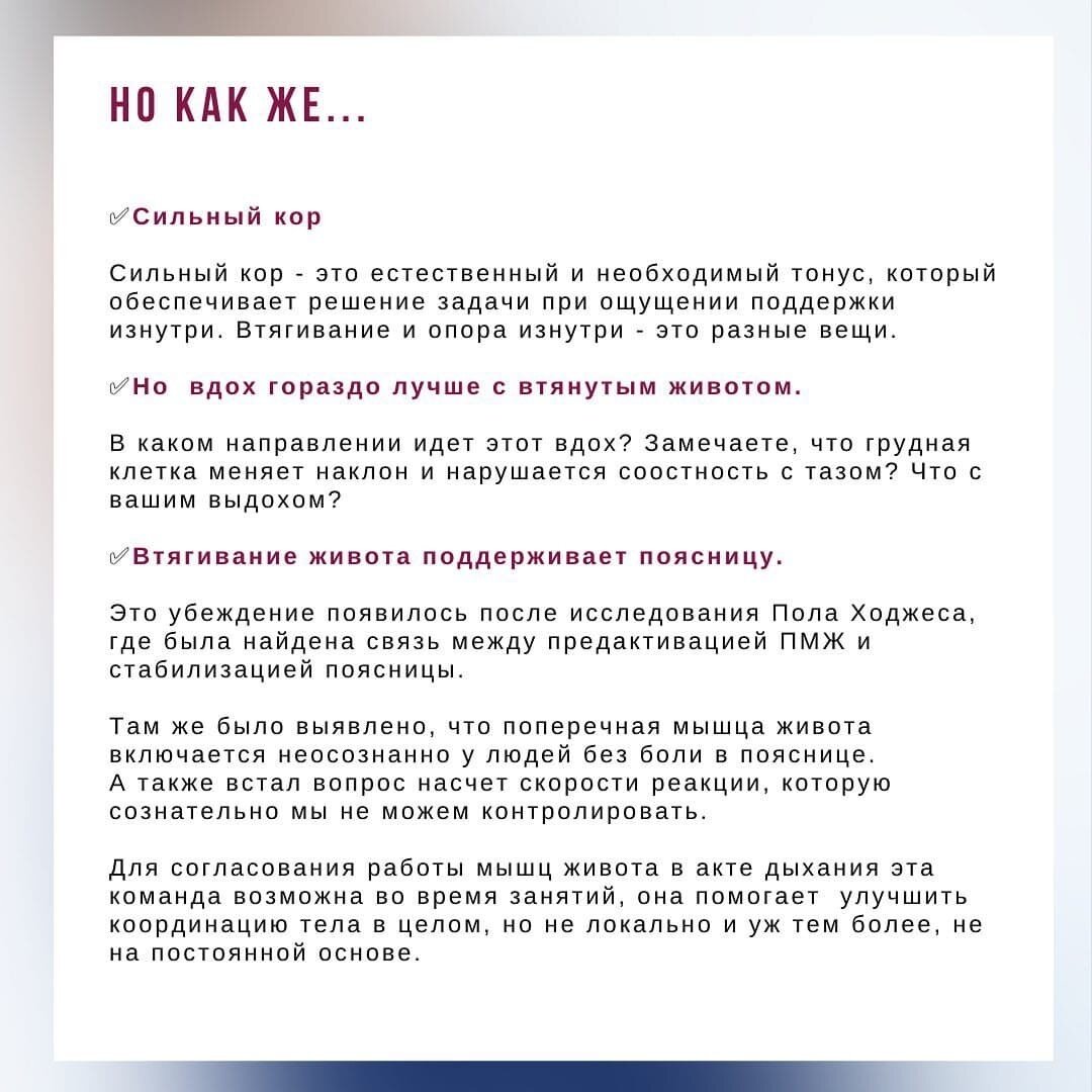 ПОЧТИ ВСЕ ГОВОРЯТ “НУ НЕТ, Я ТОЧНО НЕ ВТЯГИВАЮ”, а потом оказывается, что нижняя часть живота постоянно напряжена и она и являлась источником проблем со спиной, шеей, тазовым дном. Это реальная ситуация с курса. Девчонки неосознанно, а иногда и осознанно, держали живот подтянутым.
