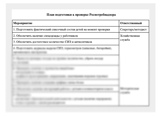 Четыре секрета для руководителей от эксперта департамента образования Перми помогут подготовиться к проверкам учредителя, Рособрнадзора, Роспотребнадзора, городской методической и муниципальной службы. Секрет 1. Циклограмма проверок Составьте и визуализируйте график проверок из официальных источников, чтобы распределить задачи по подготовке. Берите информацию из сайтов Генпрокуратуры, ФНС, ФГИС «Единый реестр проверок», внебюджетных фондов. Так вы всегда будете готовы к тому, кто, когда и с какой проверкой придет. Пример циклограммы проверок детского сада Секрет 2. План подготовки Составьте перечень конкретных мероприятий и сроков выполнения по проблемным контрольным точкам. Используйте опыт предыдущих проверок. Пример плана подготовки поможет составить локальный акт для вашего ДОО. Пример плана подготовки к проверке Открыть в полном размере Секрет 3. Режим дня и сетка занятий Роспотребнадзор проверяет все, что связано с сеткой занятий, режимом дня и планом оздоровительных меропри