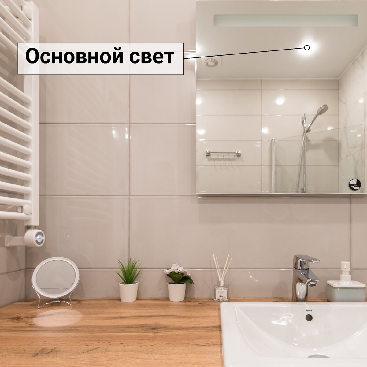Приходит мастер по укладке плитки, он же обычно сантехник и электрик в одном лице. И первый его вопрос звучит так: «Куда что будем ставить и подключать?» Когда ремонт делаешь самостоятельно, приходится не только предусматривать положение ванны, раковины, туалета, но и чётко ориентировать мастера с выводом электрики. Так под что будем штробить стены и разводить провода? 1. Основной свет Речь о потолочном освещении. Здесь важно определиться с количеством светильников — в этом поможет специалист-потолочник. А пока вы его не пригласили в гости, подумайте: круглые или квадратные плафоны хотите? Тёплый или холодный свет больше подойдёт для вашей ванной комнаты? 2. Декоративная подсветка — зеркала и полок Зеркало можно изначально взять со встроенной подсветкой, можно также подсветить его двумя-тремя низко свисающими с потолка светильниками. Другой вариант декоративного освещения — свет на мебельных полках (например, у тумбы). Что-то из этого вы планируете в своём санузле? Обязательно скажит