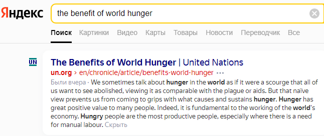 "Преимущества мирового голода (The Benefits of World Hunger)" - статья с таким названием (и содержанием под стать названию) была опубликована в журнале ООН. Да, той самой, Организации Объединённых Наций, созданной с целью борьбы за мир во всем мире, права и свободы всех людей на планете, борьбы с бедностью, голодом... Но, походу, ООН уже не та... Статья пока ещё бьётся в поисковиках: Но, если сейчас перейти на страницу со статьёй, то можно увидеть: Да, статью удалили. А всё потому что публикация вызвала однозначно негативную реакцию у читателей по всему миру. И понятно почему. Полный текст ещё можно отыскать в веб-архивах, вот здесь, например. Для своих читателей, кому лень искать, переводить и читать полностью приведём несколько самых самых отрывков: Голод имеет большое положительное значение для многих людей. Действительно, это имеет фундаментальное значение для работы мировой экономики. Голодные люди — самые производительные люди... Это основной посыл статьи. Далее: На самом деле, б