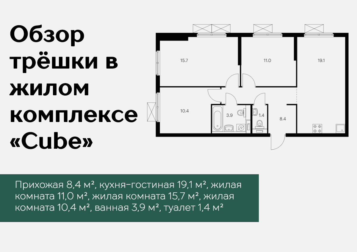 Сегодня у нас на обзоре трёхкомнатная квартира в ЖК "Cube". На этот раз обойдёмся без введения и дальше вы поймете, почему. Кухня-гостиная Надо сказать, тут есть, где разгуляться. Можно поставить компактный кухонный гарнитур, а остальное место отвести под шумные или не очень вечеринки. Для тех, кто хочет чуть более четко разделить зону кухни и зону гостиной и немного увеличить рабочую поверхность тоже найдется решение. При желании можно даже барную стойку добавить, если немного пожертвовать размером дивана. Детская Начало многообещающее. Посмотрим теперь на комнату, площадью 11 квадратных метров. По площади и конфигурации она подойдёт для детской. И снова хорошо: односпальная кровать, глубокий подоконник с подушками, шкаф и письменный стол. Даже остается место, чтобы кинуть кресло-мешок. Спальня Тут найдется место и для двуспальной кровати, и для ТВ-тумбы с туалетным столиком, и для шкафа. А остальное пространство можно заполнить уютными мелочами. Ещё одна детская Можно точно сказать,