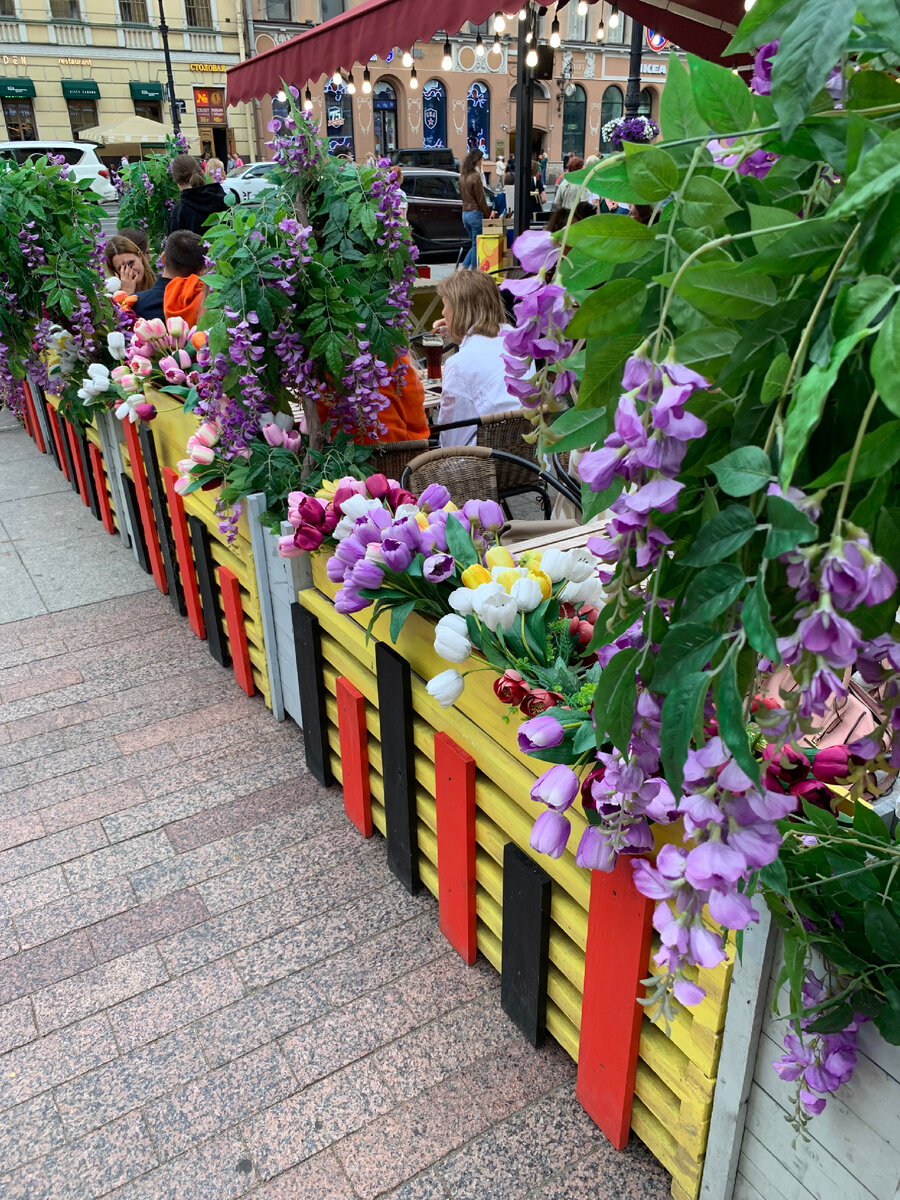 Пара слов о дизайне городской среды в летнем Петербурге. Появилась тенденция не просто ставить столики на улице, но и зонировать пространство кадками с зеленью. Посмотрим, кто и как подошёл к этому вопросу. Пример 1. Заведение Brasserie KRIEK Что видим? Очей разочарование. Адское нагромождение искусственных цветов, безвкусное и беспощадное. Ассоциация с кладбищем прямая как рельсы. Посетители, видимо, крайне нечувствительные к прекрасному люди. Пример 2. Заведение Market Place Маркет поступил иначе. Высадили растения разного цвета и фактуры, и что главное - натуральные! Уютно, стильно, кусочек жизни на пыльном Невском и вообще полный хюгге.