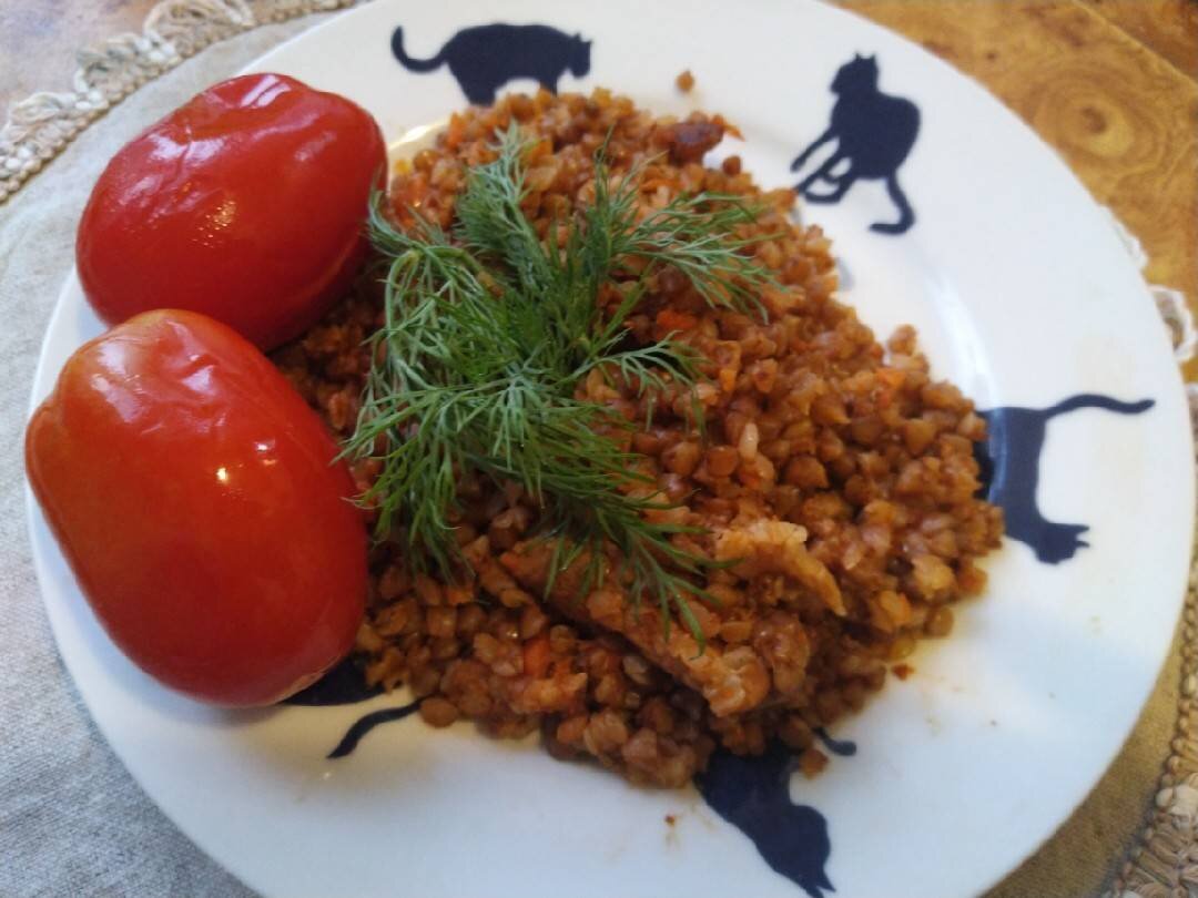 Гречка- традиционная крупа для русской кухни, которая остаётся популярной и в настоящее время Ингредиенты: гречки, свинины, луковицы, томатной пасты, морковь, сушёного кориандра, орегано, Соль, Перец , Сливочное масло для жарки Способ приготовления: В глубокой сковороде обжарить в масле лук до золотистого цвета, добавить мелко нарезанную морковь и жарить её до мягкости. Свинину, нарезанную небольшими кусочками обжарить с луком и морковью. Добавить к мясу томатную пасту, специи, соль. Тушить мясо до полуготовности, затем добавить гречку, тщательно перемешать, добавить ещё немного соли. Залить водой (примерно на 1-2 см выше уровня гречки). Накрыть сковороду крышкой, уменьшить огонь и оставить тушиться на 20-30 минут.