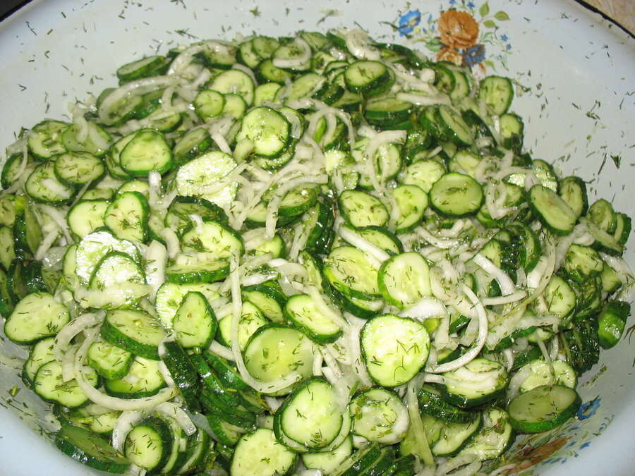 Салат из огурцов 🥒2 кг.- огурцов 🧅200 гр.- лука 🍃50 гр. - укроп 🧂8 ст. л.- уксус 🧂12 ст. л.- растительное масло 🧂3 ст. л. - сахарного песка с верхом 🧂1,5 ст. л. - соль 🧄2 зубчика чеснока Огурцы нарезать дольками, если огурцы крупные, то можно половинками. Лук порезать полукольцами, добавить порезанный укроп, соль, сахар, масло, уксус, масло, толчённый чеснок, все перемешать, оставить на 3 часа. Затем поставить на огонь, когда огурцы начнут менять цвет, закатать в стерилизованные банки. Укрыть одеялом. Из этого количества ингредиентов получается 5 баночек по 0,5л. Мои домочадцы тоже очень любят такой салатик