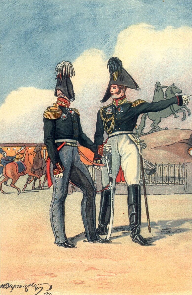 К тому же, офицеры и унтер-офицеры могли заметно изменять униформу, согласуясь с собственным вкусом В частности, была введена голубая шинель с цветным воротником для офицеров, а также произведена полная замена повседневных офицерских шлемов и гренадерских шапок на полевые шляпы, отделанные белым галуном, образующим кокарду (у серж