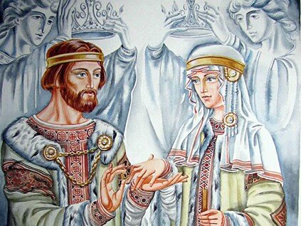 По преданиям летописцев, Петр и Феврония любили чистоту и целомудрие, защищали обижаемых, всегда были милостивыми, справедливыми и кроткими. В зрелом возрасте Петр и Феврония оставили княжество и ушли в разные монастыри. Незадолго до смерти приняли монашеский постриг с именами Давид и Евфросиния. В ответ на молитвы Господь послал им кончину в один день и час. Тела похоронили в общем гробу с тонкой перегородкой. В 1547 году Петра и Февронию причислили к лику святых. Они становятся покровителями брака и семьи. Православная церковь почитает их память ежегодно 8 июля, в 2008 году этот праздник стал государственным Всероссийским праздником - День семьи, любви и верности.