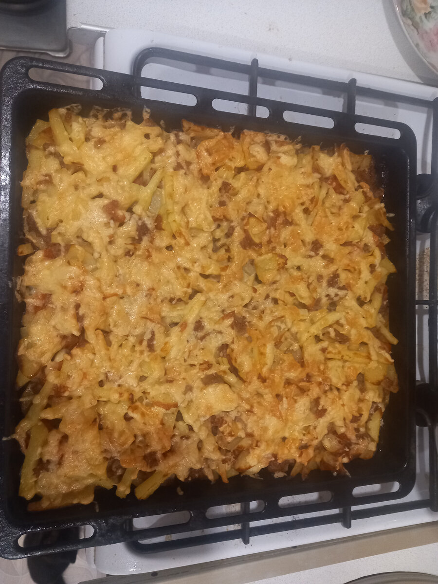 Ингредиенты 1. Картофель средний 700 грамм 2. Мясо свинины 500 грамм 3. Фарш ( свинина или говядина) 300 грамм 4. Один помидор грамм 300 5. Сыр 300 грамм 6. Лук одна головка средняя 7. Соль перец Приступаем к приготовлению!!! Берём филе свинины режим на небольшие пласты толщиной примерно 0,2 мм. солим перчим немного добавляем майонеза и всё это перемешиваем оставляем мариноваться. Нарезаем картофель На противень раскладываем мясо которое мариновалось, следом вторым слоем раскладываем картофель, третий слой раскладываем фарш заправленный с луком солью и перцем. Нарезаем помидор и тоже раскладываем У нас осталось осталось картошка и фарш решили мы перемешать и сделать ещё один вкусный слой чтобы не пропало. Накрываем фольгой и отправляем в духовку на 140-160% Проверяем на глаз готово или нет , потом достаём посыпаем тертым сыром по всей поверхности Ставим обратно в духовку и ждём когда сыр расплавиться и всё блюдо готово. Приятного аппетита!!!