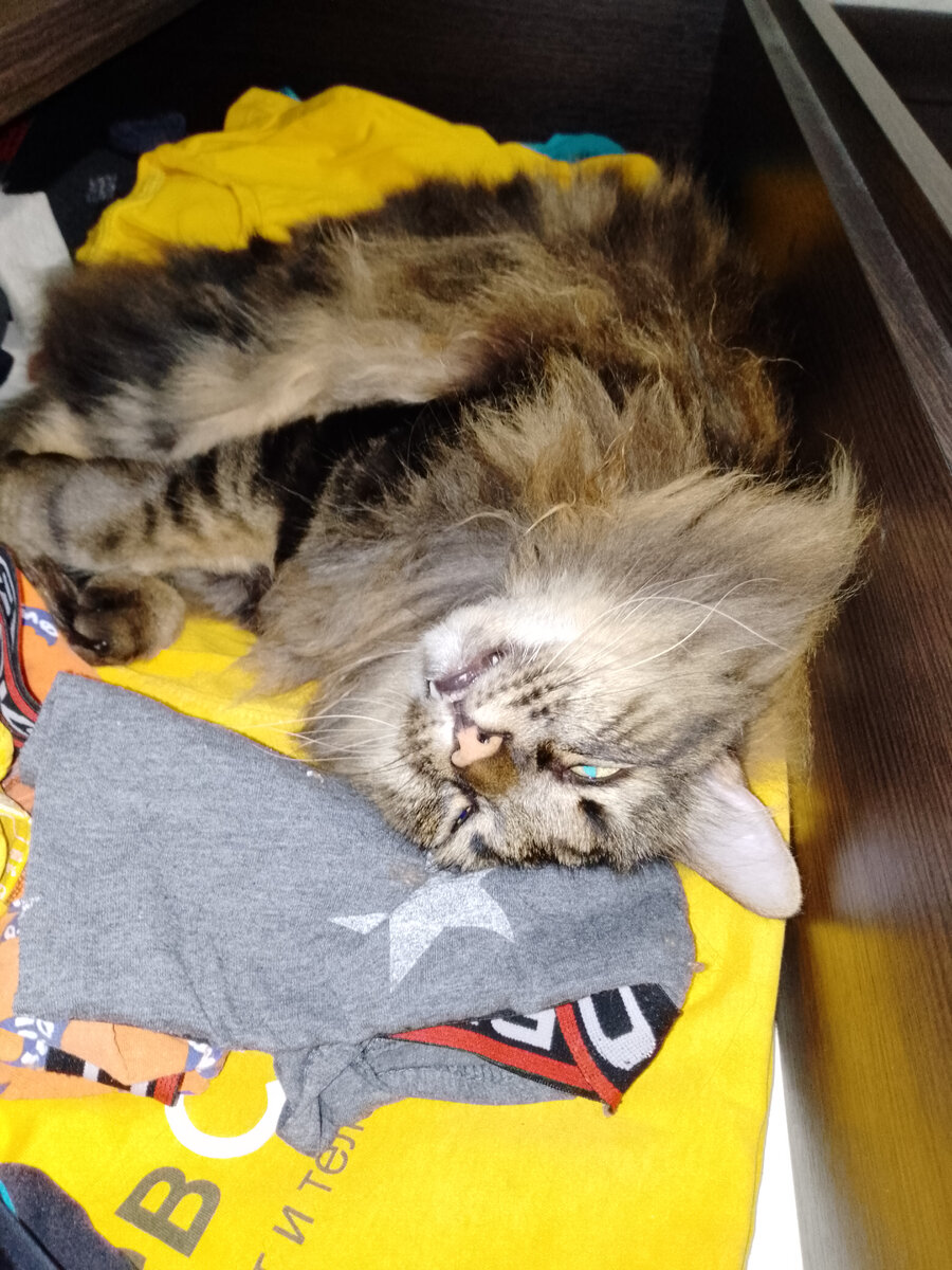 Сегодня у меня ненасыщенный день, но интересные моменты были. С самого утра хозяйку ждал сюрприз. Я стошнился. И конечно где? Конечно же на ковре. Хозяйка просто обожает его надраивать после меня с кучей средств. А потом решил навести свой порядок в ящике комода. Нет, хозяйка конечно старается, складывает вещи каждому в ящике, но я всё сделал по-своему. Порядок навел и уснул там. Нравится мне, мягенько спать. Вот так вот я отдыхал большую часть дня. И да, со мной всё хорошо, просто отдыхаю. Кстати, до этого вечером я вот так отдыхал: Жарковато просто мне. Я и кушать меньше стал, в основном по ночам ем. Так в комоде я проспал почти весь день. Встал только когда хозяйка принесла рыбу из магазина. Конечно же пошел проверил что же там принесли. В этот раз рыбки мне не перепало, ну и ничего. Окончательно из комода я вылез вечером, когда все вернулись домой. Хозяйка решила большую рыбину приготовить. Конечно же я выпросил и мне дали приличный кусочек. Всё съел. А потом хозяева стали ужинать