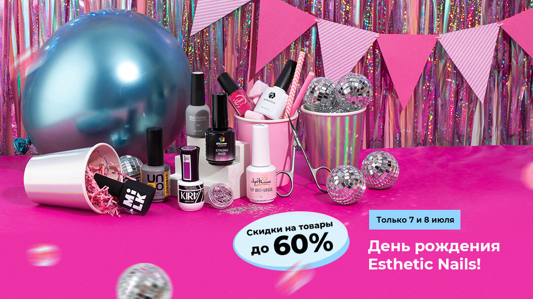 7 и 8 июля 2022 года интернет-магазин Esthetic Nails празднует день рождения. В честь этого события для всех клиентов действуют отличные предложения. Разбираемся, на что обратить внимание и что купить со скидками. Скидки до 60% на огромный ассортимент товаров для маникюра В распродаже участвуют все категории и самые популярные бренды: Bloom, Monami, Kira, Луи Филипп, Patrisa Nail и десятки других. Все скидки можно посмотреть по ссылке. Подарки за покупку ВСЕМ клиентам Сертификат на 500 ₽ на следующую покупку Еще один приятный бонус - при онлайн-оплате заказа 7 или 8 июля вы получаете сертификат на 500 ₽ на свою следующую покупку. Получается очень выгодно! Розыгрыш 50 призов и суперприза И на сладкое - кроме таких выгодных предложений, делая заказ 7-8 июля на сумму от 3000 ₽, вы становитесь участником масштабного розыгрыша. Победители получат ценные призы с наборами оборудования и материалами для маникюра. Не пропустите день рождения Esthetic Nails и обязательно заглядывайте в интернет