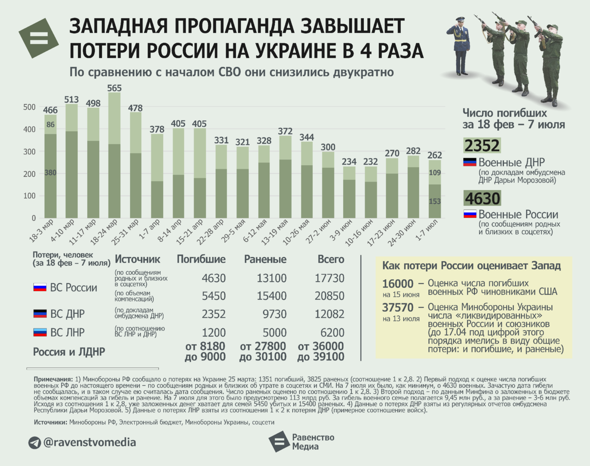 Потери России на Украине могли составить на 7 июля от 4630 до 5450 убитыми и от 13 100 до 15 400 ранеными, оценило «Равенство». Нижняя граница подсчитана по числу сообщений о прощании с погибшими, а верхняя – по объемам компенсаций, которые заложили в бюджете («Как мы считали» – см. далее). Народная милиция ДНР потеряла 2352 человека погибшими и 9730 ранеными. ЛНР потеряла примерно в 2 раза меньше. Общие потери России и союзников на 7 июля составили от 36 000 до 39 100 человек, в том числе 8200–9000 погибшими и 27 800–30 100 ранеными. Как видно, основные тяготы освобождения Украины от нацизма, учитывая численность войск, несет армия Донбасса. Вслед за сокращением театра военных действий снизились и потери: в марте ВС РФ и ДНР теряли 73 человека погибшими и 250 ранеными в день, а в июне – 36 и 120 человек. 1. Потери ВС РФ – данные Украины и Запада Минобороны Украины оценивает потери ВС России на 13.07.2022 так: 37 570 человек личного состава «ликвидировано». До 17.04.2022 этой приписки