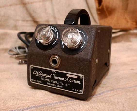 DeArmond Tremolo Control - считается первой в мире гитарной педалью. Она питается от розетки, но в ней нет ни одного(!) усиливающего радиоэлемента. Оно и не удивительно, ведь транзисторы массово стали использовать гораздо позже, А собирать тремоло на лампах в педальном исполнении... не очень то компактно:) Так вот, усиливающих элементов там нет, зато есть электродвигатель! И педаль на столько суровая что у нее есть чемоданная ручка для переноса, что делает ее похожей на утюг! Наверно, самый известный трек с использованием этого эффекта это "Money" Или Вибрации от The Ventures: Или это: Да я думаю вы слышали этот эффект в десятках популярных песен. Эффект "тремоло" это по сути просто ручка громкости, которая равномерно крутится с заданной скоростью, уменьшая и возвращая громкость в исходное значение. Такой эффект использовали уже в 1941 году совместно с электропианино Storytone. И не стоит путать тремоло и вибрато. Тремоло это модуляция звука по амплитуде, то есть по громкости, а вибрат