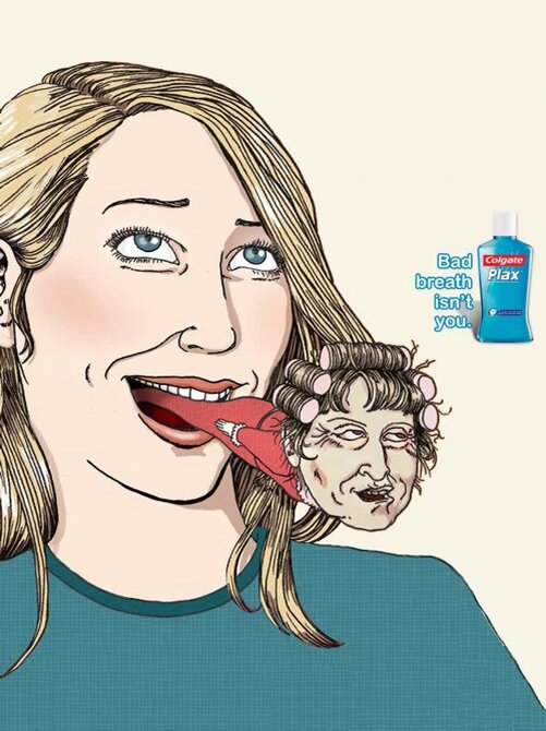 Боже, это что фильм ужасов? Кажется, что изо рта девушки точно лезет «чужой» из одноименного фильма! Но не спешите вызывать экзорциста. Все еще под контролем, ведь это креативная рекламная компания от Colgate. Да, Вам не показалось, на плакатах в этот раз не свежая вода и цветущие розы, а иллюстрации того, кем люди видят вас, если запах изо рта соответствует картинке. Например, злой старухой в бигрудях вместо милой девушки или жуткого старикашки вместо симпатичного парня. В своих рекламных плакатах Colgateне показывает, как ее средства помогут вам улучшить запах изо рта. Нет нет, в этот раз компания пошла от противного, и демонстрирует, как неприятно могут воспринимать людей из-за плохого запаха, который, как раз, возникнет, если вы не почистите свои зубы. Украшает все это слоган: «Bad breath isn’t you» - «Плохое дыхание – это не ты». Такой креатив точно легко перепутать с плакатом о фильме ужасов… Однозначно бреду стоило нарисовать свой логотип побольше. Но, тем не менее, реклама точн