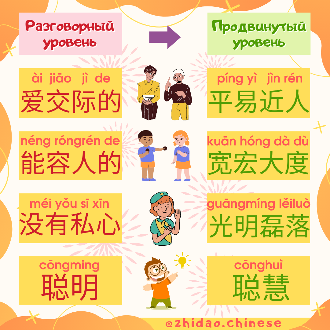 #zhidao_синонимы Сегодня предлагаем вам подборку синонимов на тему "Характер"! 🙋 🔊 Открывайте видео и включайте звук, чтобы услышать, как произносится каждое слово! 🗣️ 爱交际的 ài jiāojì de - 平易近人 píngyì jìnrén - общительный, легко идущий на контакт 😇 能容人的 néng róngrén de - 宽宏大度 kuānhóngdàdù - щедрый, великодушный, умеющий быть терпимым 🙇 没有私心(的) méiyǒu sīxīn (de) - 光明磊落 guāngmíng lěiluò - честный, благородный, не имеющий эгоистичных желаний 🧠 聪明 cōngming - 聪慧 cōnghuì умный, смышлёный, сметливый 📝 Ссылка на карточки Quizlet для изучения новых слов: https://quizlet.com/_brozyu?x=1qqt&i=2r5snr 📚 Хотите, чтобы Вы или Ваш ребенок заговорили на китайском? Напишите нам для записи на групповые / индивидуальные занятия! 🎓 #china #chinese #школакитайского #китайский #москва #язык #китайскиймосква #учукитайский