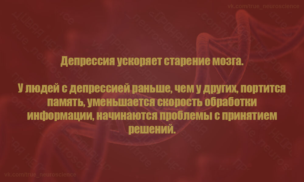 Депрессия способствует ускорению старения головного мозга. У людей, страдающих от депрессии, раньше, чем у других, снижается функционал памяти, падает скорость обработки информации, возникают проблемы с принятием решений. Источник: статья "Мозг и депрессия" в ж-ле "Наука и жизнь".