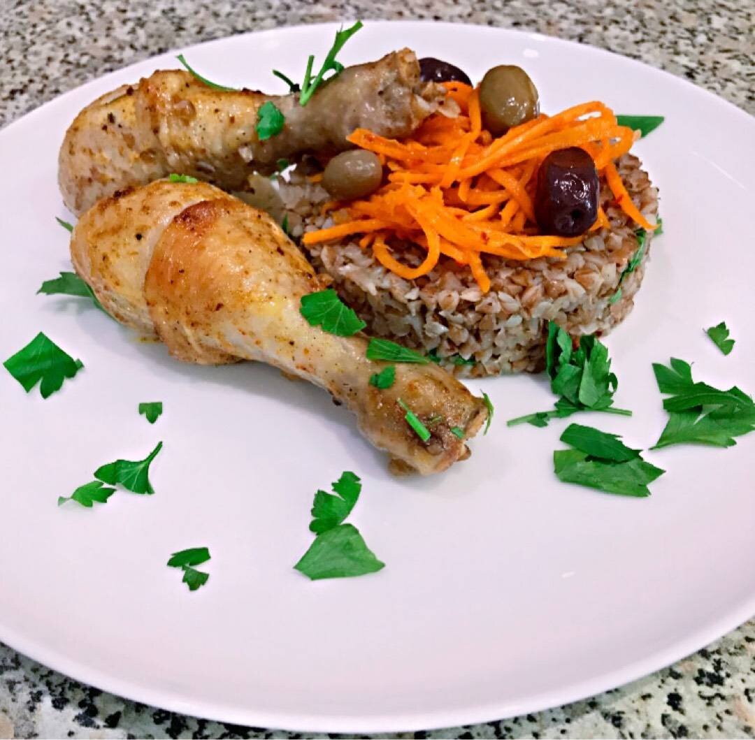 Ингредиенты: Для приготовления каши:, гречневая крупа, вода, морковь, лук репчатый, чеснок, соевый соус, мускатный орех, перец чёрный молотый, сливочное масло 82%, Для курицы:, голень куриный, соевый соус, майонез, паприка, приправа для курицы, сванская соль, Для украшения:, зелень, салат из моркови, оливки Способ приготовления: Куриный голень вымыть и обсушить бумажным полотенцем. Все овощи очистить. В мясо добавить все специи и перемешать. Гречневую крупу промыть. Морковь, лук и чеснок порезать произвольно. Затем в форму для запекания кладём порезанные овощи, масло и специи. Дальше в гречку добавить воды. Затем кладём в форму мясо птицы. Накрыть фольгой и убрать в духовку. Запекать 45 минут при t 180c.Дальше фольгу снять с формы запекаем ещё 15 минут. Готовую кашу подаём порционно. Украсить зеленью.