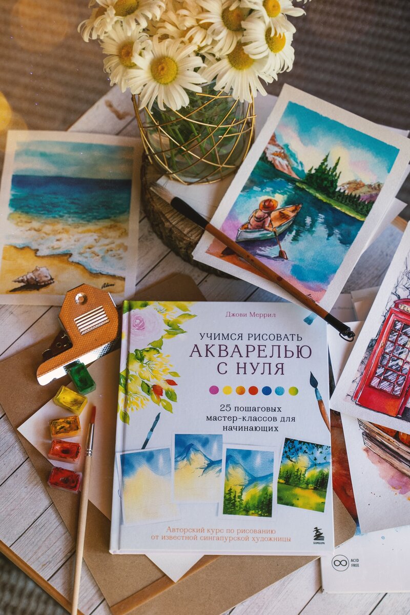 Когда я создала себе акварельный челлендж, я и подумать не могла, что в скором времени я так полюблю акварель и эта техника теперь у меня будет ассоциироваться с летом. С акварелькой получаются очень лёгкие, воздушные рисунки, картины, либо скетчи, тут главное правило - побольше воды и поменьше переживать, если пигмент с водичкой выбежит за края, ведь зачастую, именно соединение потеков воды с краской и создают красивые переливы в акварели. ⠀ Вот у меня есть художественное образование, но я все равно о многом новом узнаю из книг и сейчас издают такое количество полезной литературы для художников, что можно потеряться и забыть вообще, что хотел рисовать. ⠀ Поэтому я решила, раз я рисую, такое желание может возникнуть и у Вас и поэтому, я буду с Вами делиться теми книгами для художников, которые по моему мнению самые удачные на разных этапах Вашего творческого пути. ⠀ Ну и начну я с книги по акварели Джови Меррил «Учимся рисовать акварелью с нуля» издательство Бомбора. Эта книга состоит