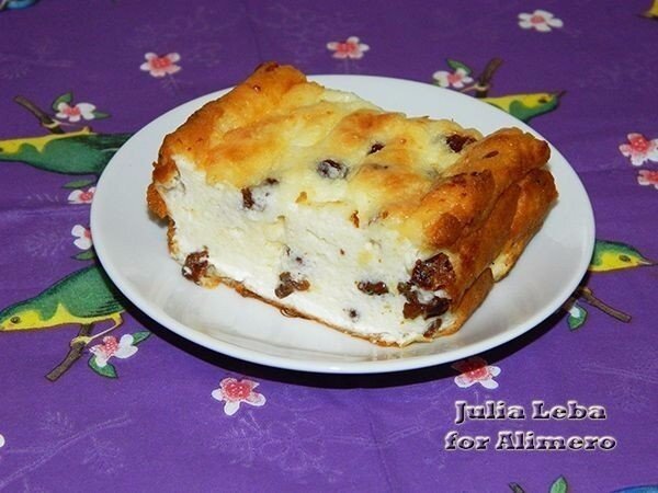 Слила воду и перешла к приготовлению самой запеканки. Взбила яйцо в пену (если вы решили добавить сахар, то это нужно сделать на данном этапе). Влила молоко, пустила соль и манную крупу.Взбила. Выложила творог (если он комочками или суховат, есть смысл протереть его через сито).Хорошенько размешала и соединила с изюмом.
