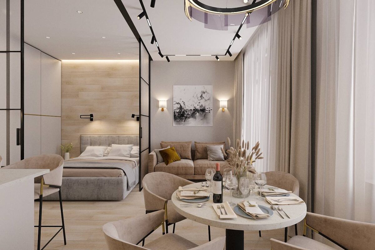Кухня-гостиная для романтических ужинов, спальня и лоджия, чтобы заняться работой или вместе расслабиться за бокалом вина.