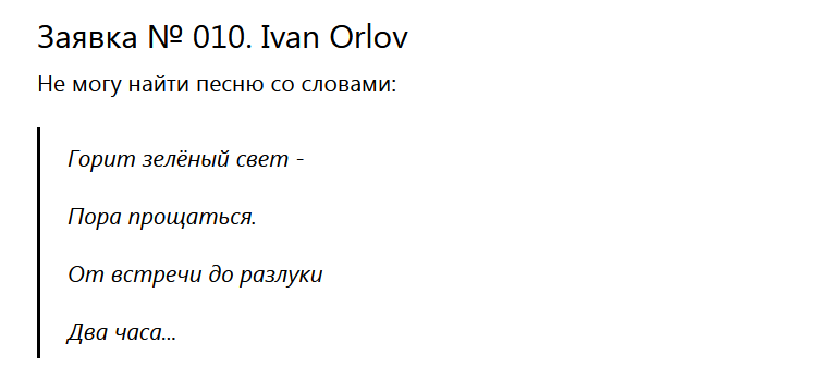 Здравствуйте! Сегодня мы на уроке "Дорогая пропажа", смотрим заявки двухлетней давности, которые не закрыты до сих пор. Но сначала напомню, что удалось найти. Выполнены заявки Заявка 009 Искали по словам. Ею оказалась песня Эдиты Пьехи "Город детства". Музыку написал Ф. Миллер, стихи - Р. Джилкинсон, музыкальная обработка А. Флярковского, русский текст - Р. Рождественского. Читатели в комментариях добавили: Интересно! Найдём оригинал. Какая красота! Пожалуй, даже лучше звучит, чем наш "Город детства". Заявка 011 ВИА "Камертон" - "Желанная". Песню написал Петр Морозов. Заявка 012 Алла Пугачева - " Наше счастье". Прозвучала в радиопередаче "С добрым утром!" в 1966 году. Заявка 014 Вадим Мулерман - "Тополиный пух" Найденные песни здесь не показываю, они есть в этой статье: Песни по заявкам, которые не нашлись за это время Песня о прощании Песню активно ищут. Увидела в сети ВК, есть предположение, что исполняет её ВИА "Верные друзья". Добавлены слова и даже напета мелодия: А