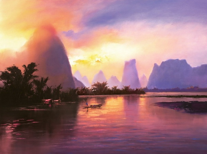 Сегодня у нас будут яркие и интересные картины с пейзажами, которые, точно отвлекут Вас от серых будней. Имя художника- Кен Хонг Лунг. Его полотна необыкновенно красивые и волшебные, не побоюсь этого слова. Они для нас - совершенно незнакомые миры. Эти картины - как окно в другое измерение. Пусть они и чересчур яркие, слишком декоративные и иногда напоминают стиль уличных художников с аэрозольными красками. Но, думаю, что после просмотра картин и прочтения статьи, равнодушных не останется. Кен Хонг Лунг родился в 1933 году в Китае. Потом жил в Гонконге и США. Художественного профессионального образования художник не получил, что отнюдь не помешало достичь своим талантом и трудолюбием высоких вершин. Его признали и критики и простые зрители уже начиная с 60х годов - с самой первой выставки в Гонконге. Основная тематика его картин - китайские и в целом азиатские восточные пейзажи с характерными чертами живописи. Особенностью полотен художника является необыкновенная цветовая гамма и тон