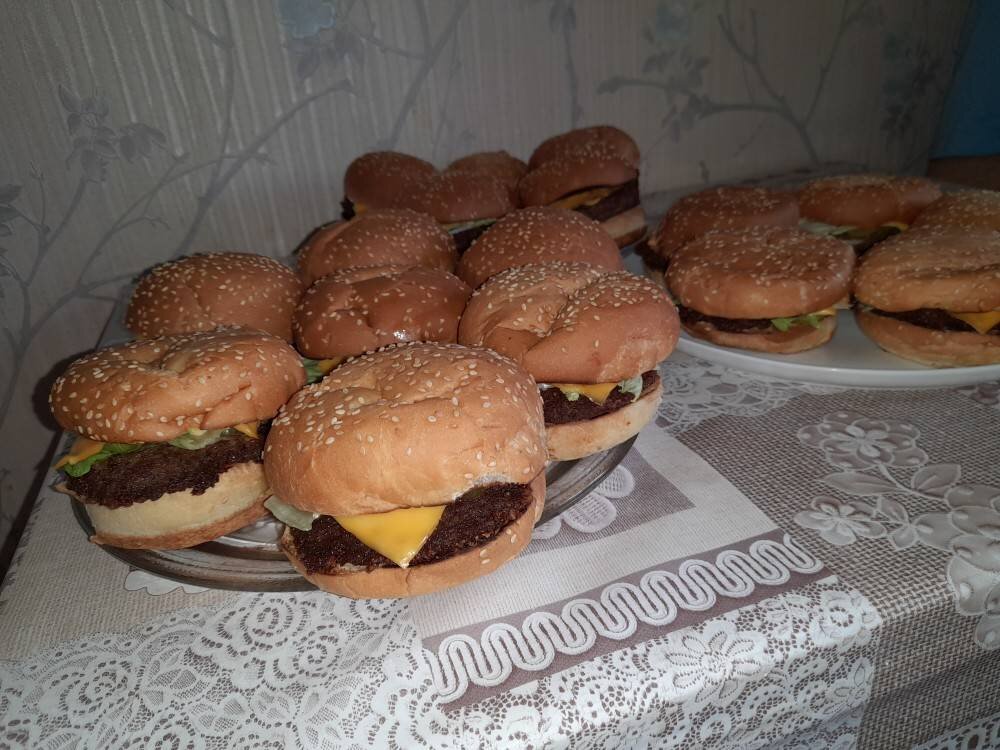 Когда хочется быстро,просто и вкусно, выручают бургеры. Ингредиенты: Булочки для бургеров (Коломенское) -, Огурцы маринованые -, Капуста пекинская, Лук репчатый, Фарш свино-говяжий -2, Сыр хохланд (для бургеров) -, Соус для бургеров Астория -2, Кетчуп (по желанию), Соль -по вкусу, Перец черный молотый- по вкусу, Уксус -1 ст/л, Сахар (для лука)- 1 ч/л Способ приготовления: Готовим фарш, солим, перчим по вкусу. Нарезаем тонкими колечками лук, кладем в глубокую тарелку, заливаем холодной водой и добавляем 1 ст/л уксуса,соль и сахар, и отставляем в сторону, чтобы лук мариновался. Нарезаем огурцы тонкими кружочками Пекинскую капусту рвем руками на некрупные кусочки. (Жесткая часть капусты не нужна). Разрезаем булочки пополам и подсушиваем на сухой сковороде, для того,чтобы они не размокли от соуса) Формуем котлеты диаметром со стандартное блюдце (так как котлеты ужарятся и как раз станут по размеру булочки) и толщиной 0,5-1 см. Обжариваем котлеты и сразу собираем наши бургеры. На низ булочк
