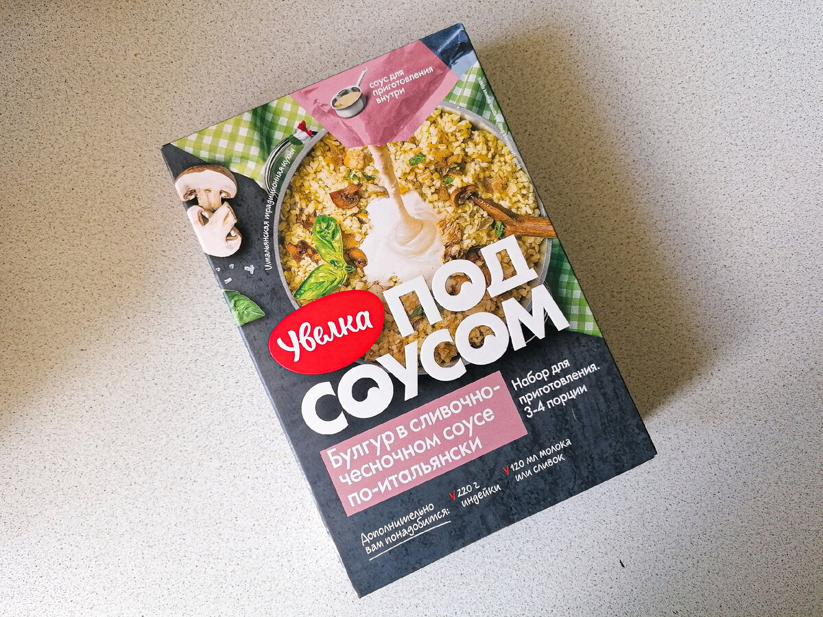 ВСЕМ ДОБРЫЙ ВЕЧЕР 😃 Спасибо огромное что подписались на мой канал Попалось мне на глаза в магазине подобное чудо, ранее не имела опыта использования таких полуфабрикатов. Так как булгур я люблю, все таки решилась попробовать. Тем более стоимость была по акции всего 99р за коробочку, как заявлено на 3-4 порции. Что ж поехали готовить! Внутри коробочки на встречает сам пакетик с булгуром, сухими грибочками, лучком, зеленью и приправами. Пахнет сама сухая смесь довольно приятно, грибочками и итальянскими травками. И конечно же пакетик с соусом Итальянским, сливочно-чесночным. По рецепту нам нужно 600мл воды подсолить и довести до кипения. После закипания всыпаем сухое содержимое пакетика, тобишь булгур и все что там есть. Варим 10-15 минуточек на слабом огне, до полного впитывания воды. Тем временем режем курочку на небольшие кусочки. В рецепте говорится об использовании индейки, но индейки у меня не было. Да и если быть откровенными она всегда получается сухой. Разогреваем в сковороде