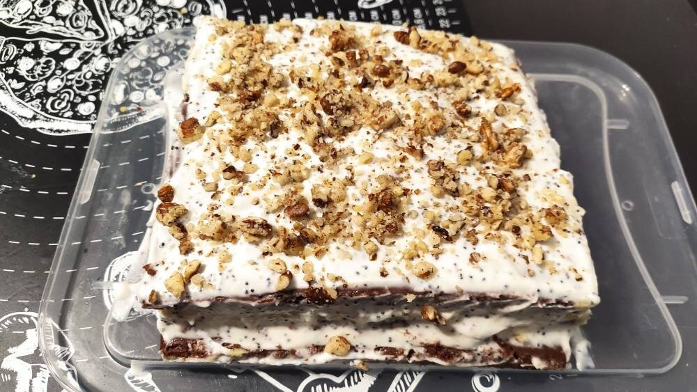 Нравиться мне что то готовить, достигать все новых и новых вершин...⛰️🗻 Сегодня простой рецепт вкусного тортика, пробуем , кушаем и оставляем фотоотзывы 🤗 Калорийность на последнем фото. Ингредиенты: Для коржей, яйца, сахара, сметаны, муки, ванилина, соды, соли, какао порошка, мака, изюма, Для крема, сметаны, сахарной пудры, лимонной кислоты по желанию Способ приготовления: В миске смешиваем яйца, сахар и соль, добавляем ванилин. Взбиваем миксером до образования лёгкой пышности. Добавляем просеянную муку и перемешиваем лопаткой. Добавляем соду гасим её уксусом и всё перемешиваем. Тесто делим на три равные части и в каждую добавляем какао, мак, изюм. В чашку с какао добавляем столовую ложку сметаны чтобы тесто не было густым. Большой противень с телем пергаментную бумагу либо антипригарный коврик и равномерно распределяем три равных коржа. Отправляем в заранее разогретую духовку до 160° на 15 минут. После корж достаём и даём ему остыть. Пока остывает корж замешиваем крем соединяем сме