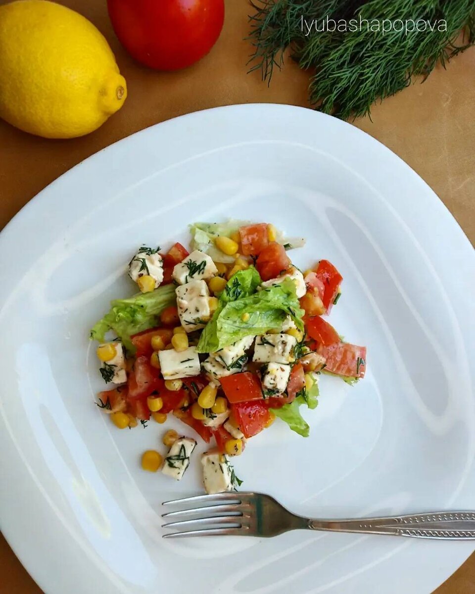 #летнийсалат #кукпадготовит #вторник #салатскукурузой #салатсфетой #food_Love ♥️ 🥗 Салат с консервированной кукурузой, помидорами, салатными листьями и сыром фета - это простое, лёгкое и освежающее летнее блюдо. Ингредиенты: консервированной кукурузы, помидора, салатных листа, сыра фета, ложка растительного масла, лимонного сока, перец чёрный молотый, сушёный базилик, свежий укроп Способ приготовления: Салатные листья промыть, просушить, порвать руками и выложить в салатник. Свежие помидоры помыть и нарезать на кубики. С кукурузы слить жидкость и переложить её в салатник. Фету нарезать кубиками или раскрошить руками. Укроп промыть и измельчить. Заправить салат растительным маслом, добавить сок лимона, сушёный базилик и чёрный перец. Перемешать и разложить по тарелкам. 💡 Соль я не добавляю из-за солоноватого вкуса феты. Салат с кукурузой, помидорами и фетой готов! Приятного аппетита! 👌🏻😋