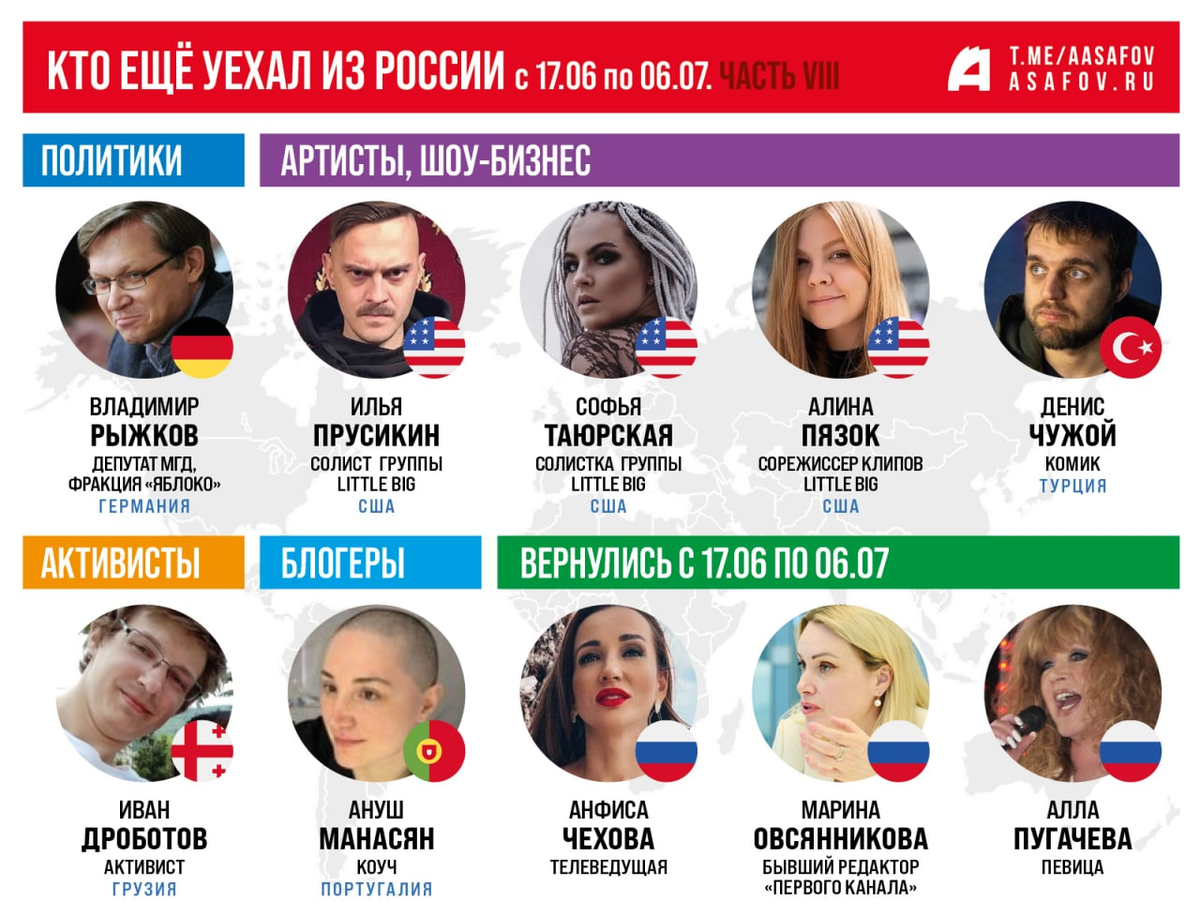 Продолжаю анализировать волну эмиграции из России. Число покинувших Россию продолжает сокращаться. За минувшие 3 недели из страны уехали 7 человек. Среди них 1 политик и 1 политический активист. Это депутат МГД от фракции «Яблоко» Владимир Рыжков и активист Иван Дроботов. Ранее в «Яблоке» заявили, что Рыжков уехал в отпуск и вернется к началу осенней сессии в МГД. Также в пресс-службе партии сообщали о его планах по участию в выдвижении кандидатов на московские муниципальные выборы в качестве члена штаба. Но этого не произошло, Рыжкова на съезде 6 июля не было. Из оставшихся 5 уехавших трое — участники группы Little Big. Уехали также комик Денис Чужой и коуч Ануш Манасян. Вместе с тем стало известно о возвращении 3 ранее покинувших Россию. Если приезд телеведущей Анфисы Чеховой СМИ почти не освещали, то возвращение Аллы Пугачевой и бывшего редактора «Первого канала» Марины Овсянниковой вызвало резонанс. Всего с начала спецоперации из России уехали 176 известных людей, из них верн