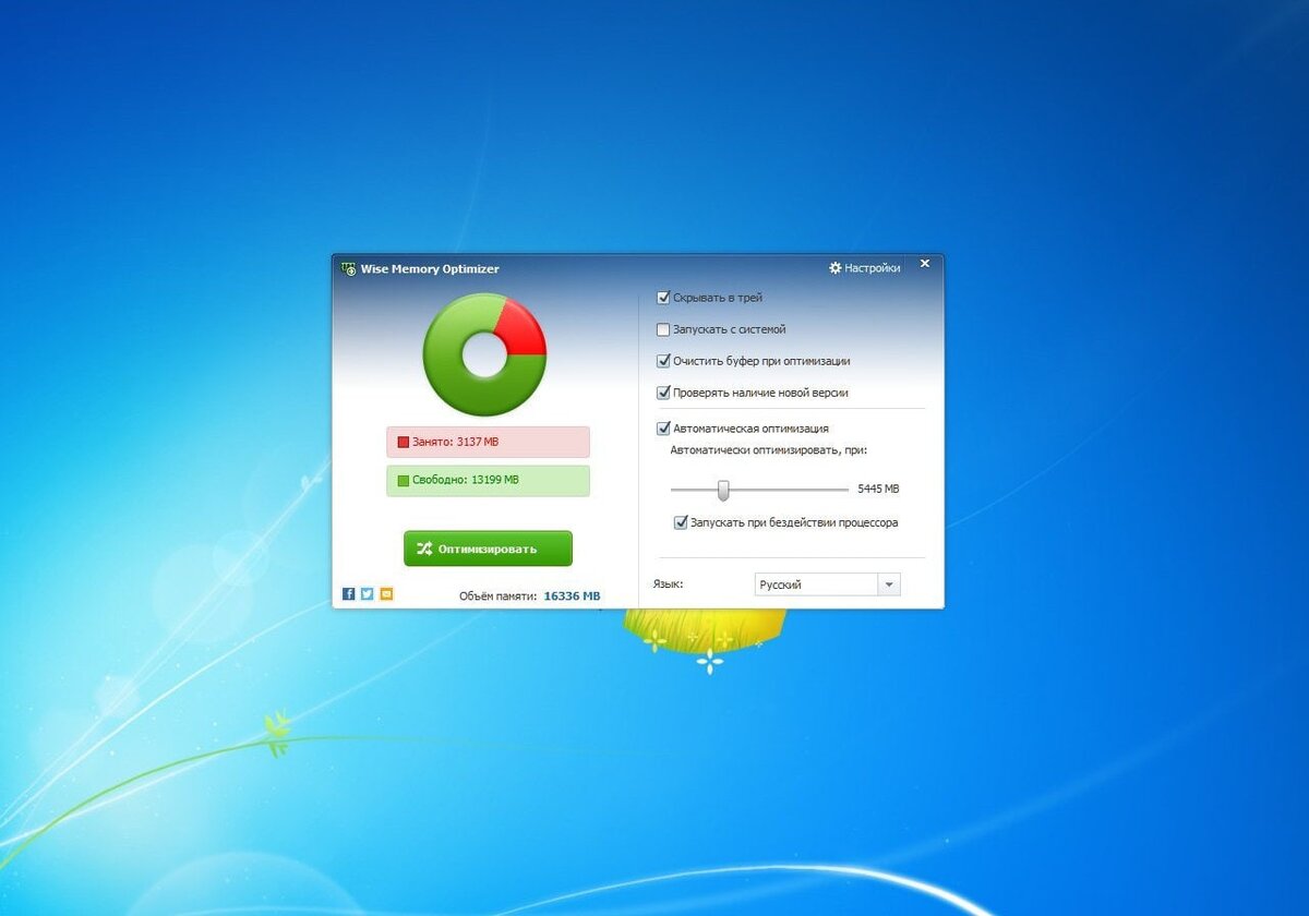 СКАЧАТЬ ПРОГРАММУ МОЖНО ТУТ Wise Memory Optimizer - утилита для освобождения оперативной памяти, увеличения скорости и улучшения производительности ПК. Позволяет высвободить и настроить оперативную память, занятую бесполезными приложениями для повышения производительности ПК. Проста в использовании, подходит как для новичков, так и экспертам. 💿 Версия: v4.1.6.118 🌐 Язык интерфейса : Русский 🖥 OC: Windows: x86/x64 🔐 Активация: Не требуется #система #очистка