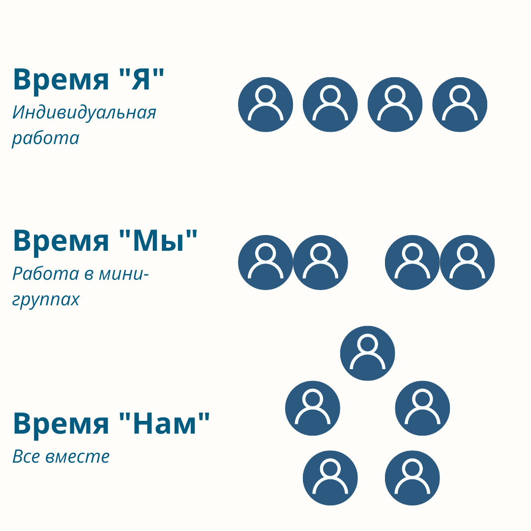 Часто в своей работы мы используем очень удобную и простую для понимания схему взаимодействия на онлайн и офлайн мероприятиях. Схема называется «Я-Мы-Нам». Она отлично подойдет для онлайн взаимодействия, когда часть сотрудников находятся на удаленке, а часть в офисе или когда все сотрудники в разных городах и необходимо проводить эффективные онлайн-встречи, на которых каждый сможет высказаться и быть услышанным. Существует три этапа, которые помогут вам максимально вовлечь сотрудников на онлайн встрече: 1. Время «Я» Часто одна из главных проблем заключается в том, что не всегда получается высказать свои идеи и быть услышанным. Время «Я» очень важно во время мозговых штурмов и осмысления важных вопросов. Оно необходимо для того, чтобы каждый сотрудник мог выписать свои идеи и проанализировать самостоятельно ситуацию, в дальнейшем предложив свои варианты для решения той или иной проблемы. 2. Время «Мы» Это время работы с мини-группах, когда каждый участник может поделиться своими идеями