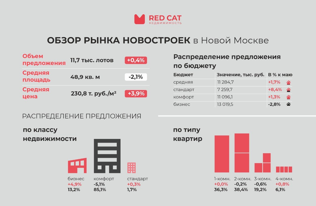 · В Новой Москве в июне отмечалась высокая активность по выводу новых объектов - стартовали продажи в 8 новых корпусах, общее количество лотов, находящихся на экспозиции выросло на 0,4%, в итоге общий объем предложения снова обновил пятилетний максимум и составил 11,71 тыс. лотов. · В структуре предложения по классам жилья отмечались заметные сдвиги в сторону новостроек бизнес сегмента, этому способствовало и то, что основной объем нового предложения пришелся на бизнес-класс, и то, что доступные новостройки комфорткласса вымываются из экспозиции быстрее. · Доля квартир бизнес сегмента прибавила 4,9 п/п и составила 13,2%. Доля комфорткласса потеряла 5,1 п/п и составила 85,1%. доля стандарт-класса за месяц выросла на 0,3 п/п и составила 1,7%. · Доля студий и 1-комн. квартир не изменилась и составила 36,3%, 2-комн. лотов снизилась на 0,2 п/п до 38,4%. Доля 3-комн. квартир потеряла 0,6 п/п и составила 19,2%, доля многокомнатных квартир в июне выросла на 0,8 п/п и составила 6,1%. · По итог